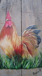2008Haan geschilderd op verweerde steigerdelen. Afgelakt zodat het schilderij ook buiten kan hangen.